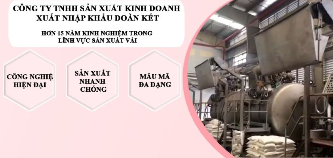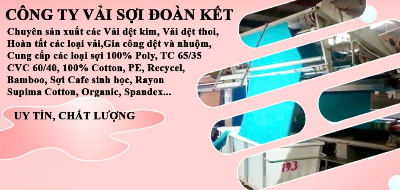 Vải sợi Công ty Đoàn Kết – Đơn vị hàng đầu cung cấp Vải sợi & Vải dệt công nghiệp chất lượng cao, giá tốt tại TP.HCM, Bình Dương, Tây Ninh, Long An, Bà Rịa Vũng Tàu, Hà Nội, Hải Dương và các tỉnh miền Tây. Chúng tôi cam kết mang đến sản phẩm đa dạng, đáp ứng mọi nhu cầu của ngành may mặc.